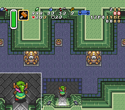 Using Y Items is not possible until Link has fully cleared the entry doorway. The lowest y-coordinate that this can be done is 19BF, but because of Link's upward movement pattern this will usually be at 19BE.80 as shown in the image above, 17 frames after gaining control of Link.
