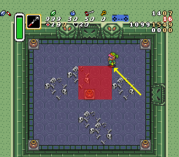 The four Stalfos spawns in this room are triggered as soon as Link enters the red rectangle shown in the above image, at which point the spawn points will be fixed. The four Link sprites show the furthest points away from the center that will still trigger the spawns. To be inside the rectangle, Link's horizontal coordinate must be within 1069 and 1098 and his vertical coordinate must be within 1549 and 1578. Note that this essentially encompasses a 3x3 square of the floor tiles.