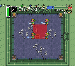 For the fire rod strategy, a third rod shot cannot be used until the "flame" from the first shot is finished burning. For this reason, it is recommended to trigger the Stalfos spawns by moving down into the rectangle, and shooting the left Stalfos spawn last after a brief diagonal walk.
